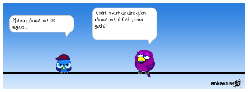 Case 1:Bird 1: Maman, j'aime pas les végans... | Case 2: Bird 1: Chéri, avant de dire qu'on n'aime pas, il faut y avoir gouté ! | Case 3: