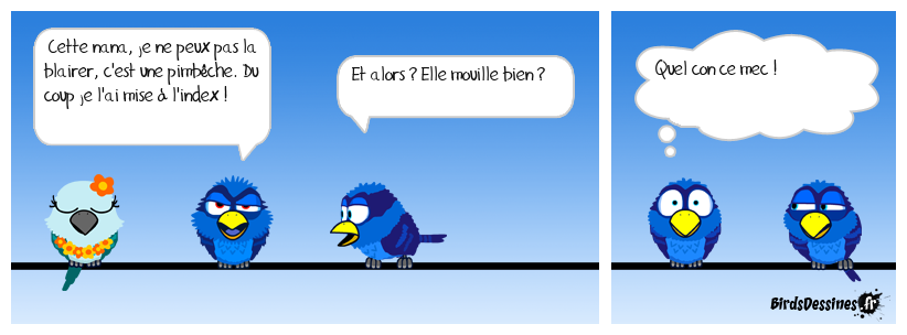 Case 1:Bird 1: Cette nana, je ne peux pas la blairer, c'est une pimbêche. Du coup je l'ai mise à l'index ! | Case 2: Bird 1: Et alors ? Elle mouille bien ? | Case 3: Bird 1: Quel con ce mec !