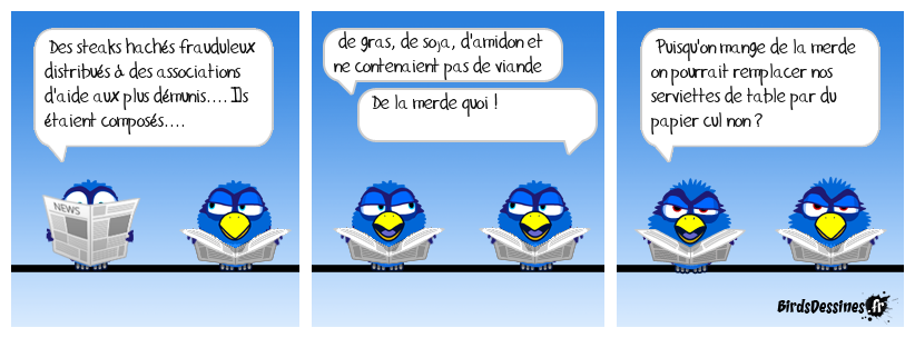 Case 1:Bird 1: Des steaks hachés frauduleux distribués à des associations d'aide aux plus démunis.... Ils étaient composés.... | Case 2: Bird 1: de gras, de soja, d'amidon et ne contenaient pas de viande Bird 2: De la merde quoi ! | Case 3: Bird 1: Puisqu'on mange de la merde on pourrait remplacer nos serviettes de table par du papier cul non ?