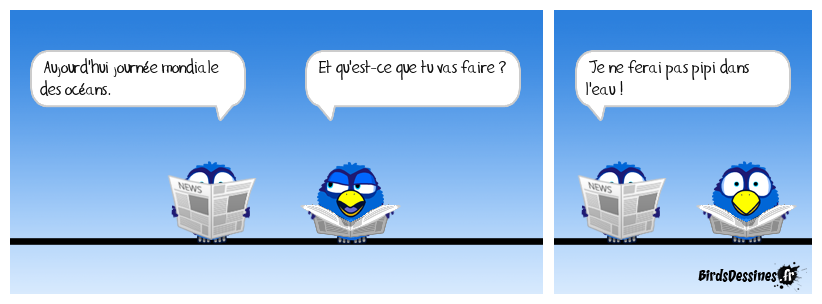 Case 1:Bird 1: Aujourd'hui journée mondiale des océans. | Case 2: Bird 1: Et qu'est-ce que tu vas faire ? | Case 3: Bird 1: Je ne ferai pas pipi dans l'eau !