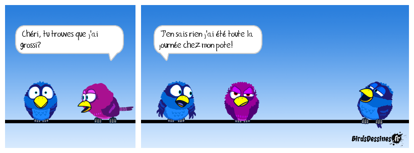 Case 1:Bird 1: Chéri, tu trouves que j'ai grossi? | Case 2: Bird 1: J'en sais rien j'ai été toute la journée chez mon pote! | Case 3: