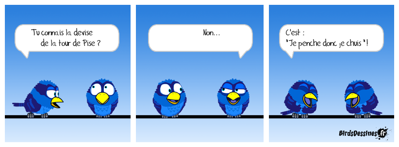 Case 1:Bird 1: Tu connais la devise de la tour de Pise ? | Case 2: Bird 1: Non... | Case 3: Bird 1: C'est : "Je penche donc je chuis "!