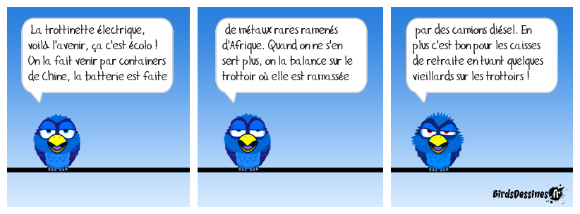 Case 1:Bird 1: La trottinette électrique, voilà l'avenir, ça c'est écolo ! On la fait venir par containers de Chine, la batterie est faite de | Case 2: Bird 1: de métaux rares ramenés d'Afrique. Quand on ne s'en sert plus, on la balance sur le trottoir où elle est ramassée | Case 3: Bird 1: par des camions diésel. En plus c'est bon pour les caisses de retraite en tuant quelques vieillards sur les trottoirs !