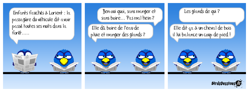 Case 1:Bird 1: Enfants fauchés à Lorient : la passagère du véhicule dit avoir passé toutes ses nuits dans la forêt..... | Case 2: Bird 1: Ben oui quoi, sans manger et sans boire... Pas mal hein ? Bird 2: Elle dû boire de l'eau de pluie et manger des glands ? | Case 3: Bird 1: Les glands de qui ? Bird 2: Elle dit ça à un cheval de bois il lui balance un coup de pied !