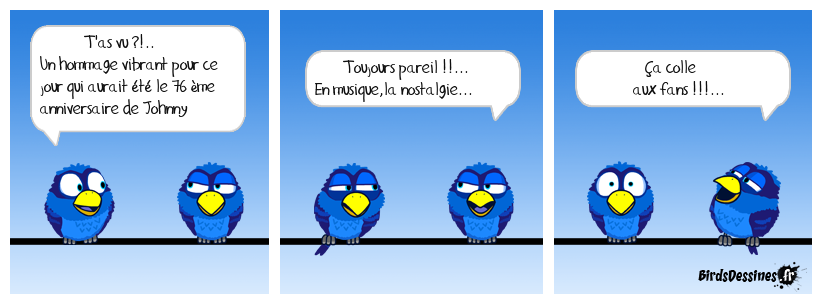 Case 1:Bird 1: T'as vu ?!.. Un hommage vibrant pour ce jour qui aurait été le 76 ème anniversaire de Johnny | Case 2: Bird 1: Toujours pareil !!... En musique,la nostalgie... | Case 3: Bird 1: Ça colle aux fans !!!...