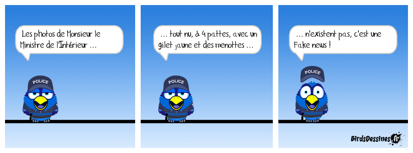 Case 1:Bird 1: Les photos de Monsieur le Ministre de l'Intérieur ... | Case 2: Bird 1: ... tout nu, à 4 pattes, avec un gilet jaune et des menottes ... | Case 3: Bird 1: ... n'existent pas, c'est une Fake news !