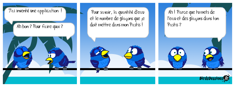 Case 1:Bird 1: J'ai inventé une application !Bird 2: Ah bon ? Pour faire quoi ? | Case 2: Bird 1: Pour savoir, la quantité d'eau et le nombre de glaçons que je doit mettre dans mon Pastis ! | Case 3: Bird 1: Ah ! Parce que tu mets de l'eau et des glaçons dans ton Pastis ?