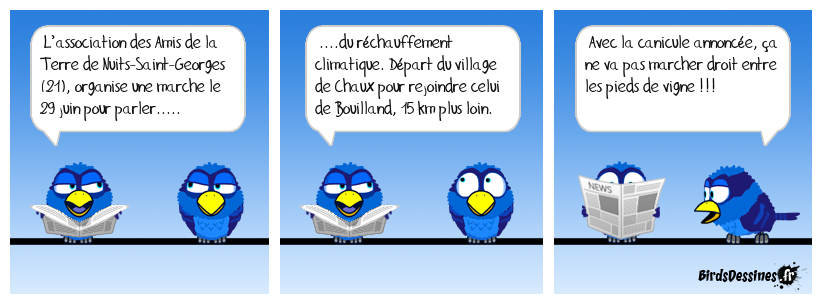Case 1:Bird 1: L’association des Amis de la Terre de Nuits-Saint-Georges (21), organise une marche le 29 juin pour parler..... | Case 2: Bird 1: ....du réchauffement climatique. Départ du village de Chaux pour rejoindre celui de Bouilland, 15 km plus loin. | Case 3: Bird 1: Avec la canicule annoncée, ça ne va pas marcher droit entre les pieds de vigne !!!