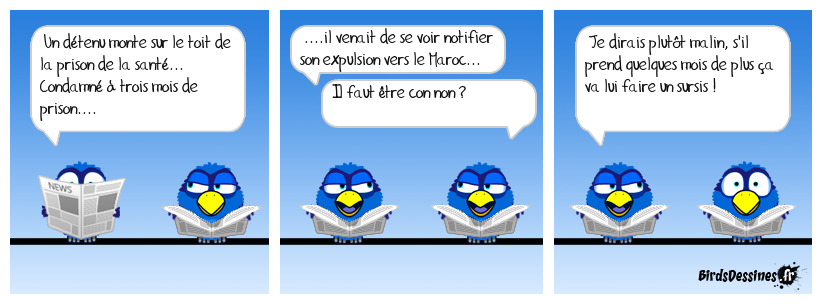 Case 1:Bird 1: Un détenu monte sur le toit de la prison de la santé... Condamné à trois mois de prison.... | Case 2: Bird 1: ....il venait de se voir notifier son expulsion vers le Maroc... Bird 2: Il faut être con non ? | Case 3: Bird 1: Je dirais plutôt malin, s'il prend quelques mois de plus ça va lui faire un sursis !