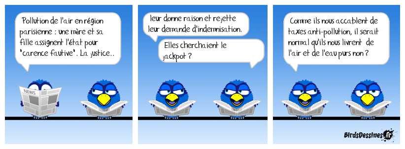 Case 1:Bird 1: Pollution de l'air en région parisienne : une mère et sa fille assignent l'état pour "carence fautive". La justice.. | Case 2: Bird 1: leur donne raison et rejette leur demande d'indemnisation. Bird 2: Elles cherchaient le jackpot ? | Case 3: Bird 1: Comme ils nous accablent de taxes anti-pollution, il serait normal qu'ils nous livrent de l'air et de l'eau purs non ?