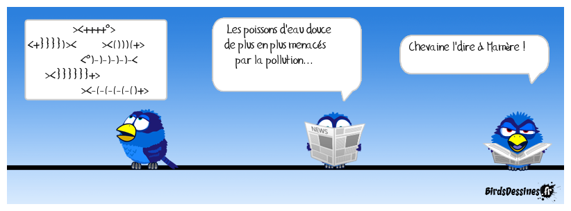 Case 1:Bird 1: ><++++°> <+}}}})>< ><()))(+> <°)-)-)-)-)-< ><}}}}}}+> ><-(-(-(-(-()+> | Case 2: Bird 1: Les poissons d'eau douce de plus en plus menacés par la pollution... | Case 3: Bird 1: Chevaine l'dire à Mamère !