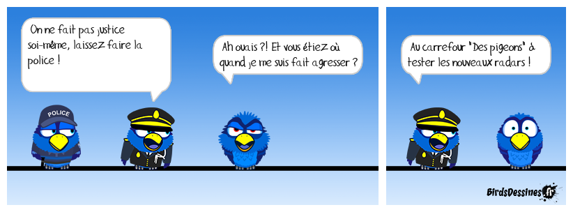 Case 1:Bird 1: On ne fait pas justice soi-même, laissez faire la police ! | Case 2: Bird 1: Ah ouais ?! Et vous étiez où quand je me suis fait agresser ? | Case 3: Bird 1: Au carrefour "Des pigeons" à tester les nouveaux radars !