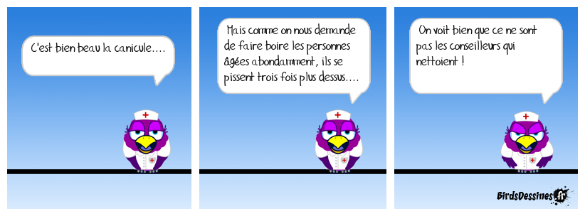 Case 1:Bird 1: C'est bien beau la canicule.... | Case 2: Bird 1: Mais comme on nous demande de faire boire les personnes âgées abondamment, ils se pissent trois fois plus dessus.... | Case 3: Bird 1: On voit bien que ce ne sont pas les conseilleurs qui nettoient !