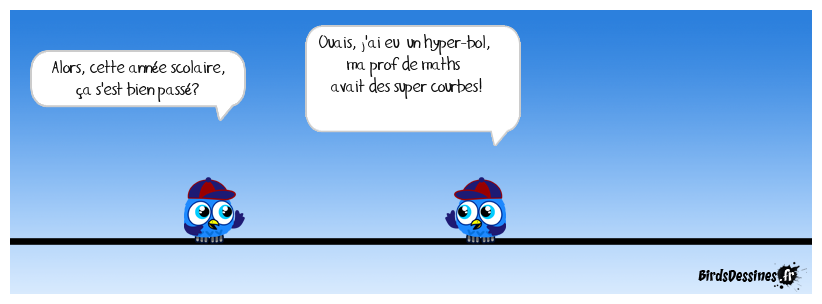 Case 1:Bird 1: Alors, cette année scolaire, ça s'est bien passé? | Case 2: Bird 1: Ouais, j'ai eu un hyper-bol, ma prof de maths avait des super courbes! | Case 3: