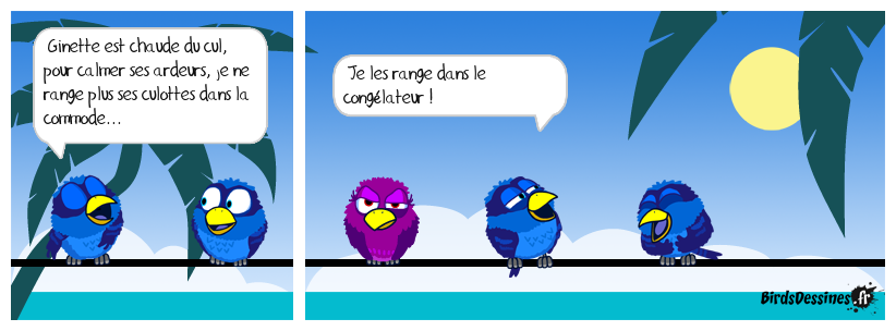 Case 1:Bird 1: Ginette est chaude du cul, pour calmer ses ardeurs, je ne range plus ses culottes dans la commode... | Case 2: Bird 1: Je les range dans le congélateur ! | Case 3: