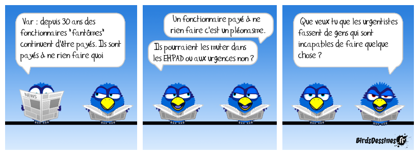 Case 1:Bird 1: Var : depuis 30 ans des fonctionnaires "fantômes" continuent d'être payés. Ils sont payés à ne rien faire quoi | Case 2: Bird 1: Un fonctionnaire payé à ne rien faire c'est un pléonasme. Bird 2: Ils pourraient les muter dans les EHPAD ou aux urgences non ? | Case 3: Bird 1: Que veux tu que les urgentistes fassent de gens qui sont incapables de faire quelque chose ?