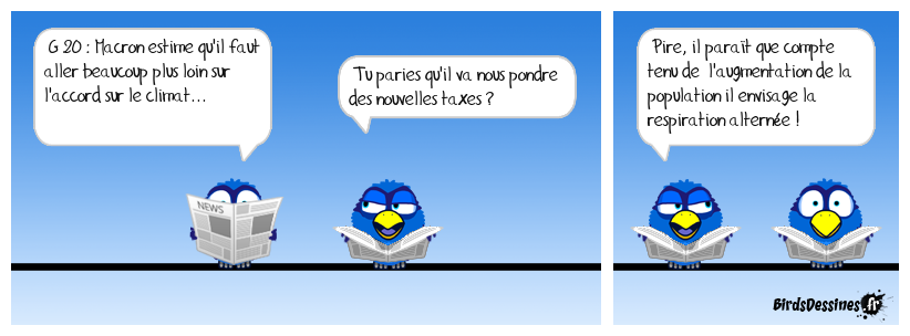 Case 1:Bird 1: G 20 : Macron estime qu'il faut aller beaucoup plus loin sur l'accord sur le climat... | Case 2: Bird 1: Tu paries qu'il va nous pondre des nouvelles taxes ? | Case 3: Bird 1: Pire, il paraît que compte tenu de l'augmentation de la population il envisage la respiration alternée !
