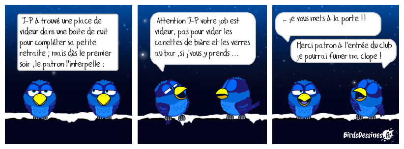 Case 1:Bird 1: J-P à trouvé une place de videur dans une boite de nuit pour compléter sa petite retraite ; mais dès le premier soir ,le patron l'interpelle : | Case 2: Bird 1: Attention J-P votre job est videur, pas pour vider les canettes de bière et les verres au bar ,si j'vous y prends ... | Case 3: Bird 1: … je vous mets à la porte !! Bird 2: Merci patron à l'entrée du club je pourrai fumer ma clope !