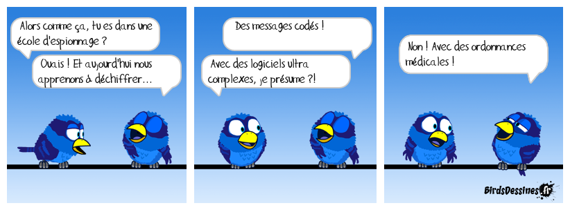 Case 1:Bird 1: Alors comme ça, tu es dans une école d'espionnage ?Bird 2: Ouais ! Et aujourd'hui nous apprenons à déchiffrer... | Case 2: Bird 1: Des messages codés ! Bird 2: Avec des logiciels ultra complexes, je présume ?! | Case 3: Bird 1: Non ! Avec des ordonnances médicales !