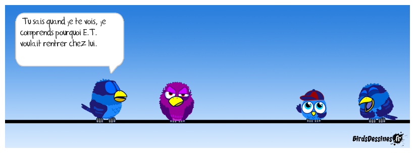 Case 1:Bird 1: Tu sais quand je te vois, je comprends pourquoi E.T. voulait rentrer chez lui. | Case 2: | Case 3: