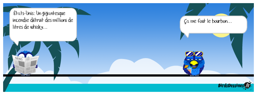 Case 1:Bird 1: États-Unis: Un gigantesque incendie détruit des millions de litres de whisky... | Case 2: | Case 3: Bird 1: Ça me fout le bourbon...