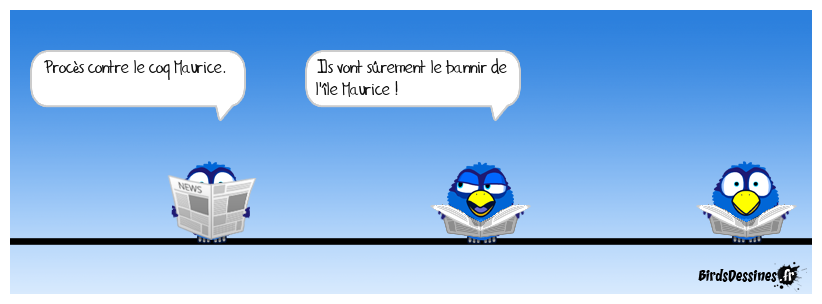 Case 1:Bird 1: Procès contre le coq Maurice. | Case 2: Bird 1: Ils vont sûrement le bannir de l'ïle Maurice ! | Case 3: