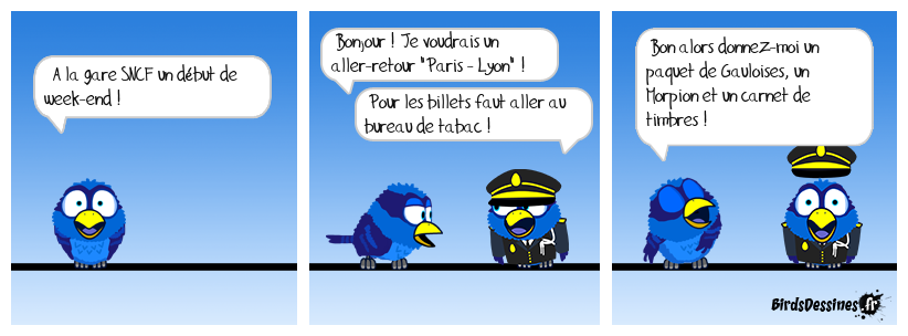 Case 1:Bird 1: A la gare SNCF un début de week-end ! | Case 2: Bird 1: Bonjour ! Je voudrais un aller-retour "Paris - Lyon" ! Bird 2: Pour les billets faut aller au bureau de tabac ! | Case 3: Bird 1: Bon alors donnez-moi un paquet de Gauloises, un Morpion et un carnet de timbres !