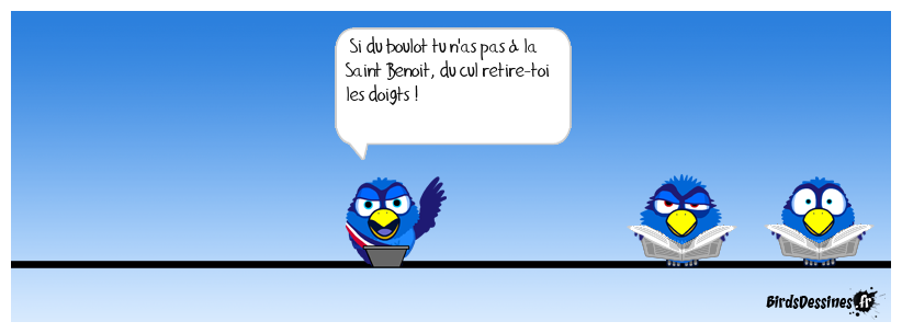 Case 1: | Case 2: Bird 1: Si du boulot tu n'as pas à la Saint Benoit, du cul retire-toi les doigts ! | Case 3: