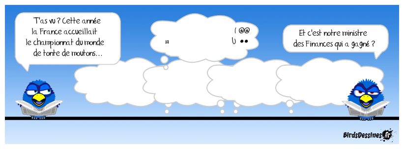 Case 1:Bird 1: T'as vu ? Cette année la France accueillait le championnat du monde de tonte de moutons... | Case 2: Bird 1: ( @@ ¤ U •• | Case 3: Bird 1: Et c'est notre ministre des Finances qui a gagné ?