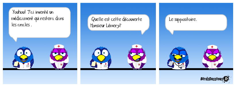 Case 1:Bird 1: Youhou! J'ai inventé un médicament qui restera dans les anales . | Case 2: Bird 1: Quelle est cette découverte Monsieur Lémery? | Case 3: Bird 1: Le suppositoire.