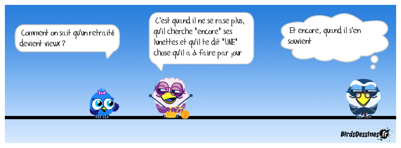 Case 1:Bird 1: Comment on sait qu'un retraité devient vieux ? | Case 2: Bird 1: C'est quand il ne se rase plus, qu'il cherche "encore" ses lunettes et qu'il te dit "UNE" chose qu'il a à faire par jour | Case 3: Bird 1: Et encore, quand il s'en souvient