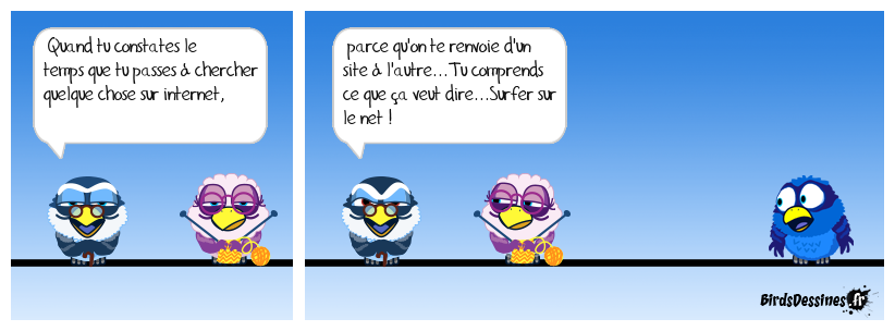 Case 1:Bird 1: Quand tu constates le temps que tu passes à chercher quelque chose sur internet, | Case 2: Bird 1: parce qu'on te renvoie d'un site à l'autre...Tu comprends ce que ça veut dire...Surfer sur le net ! | Case 3: