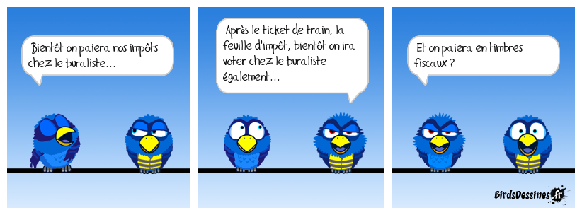 Case 1:Bird 1: Bientôt on paiera nos impôts chez le buraliste... | Case 2: Bird 1: Après le ticket de train, la feuille d'impôt, bientôt on ira voter chez le buraliste également... | Case 3: Bird 1: Et on paiera en timbres fiscaux ?