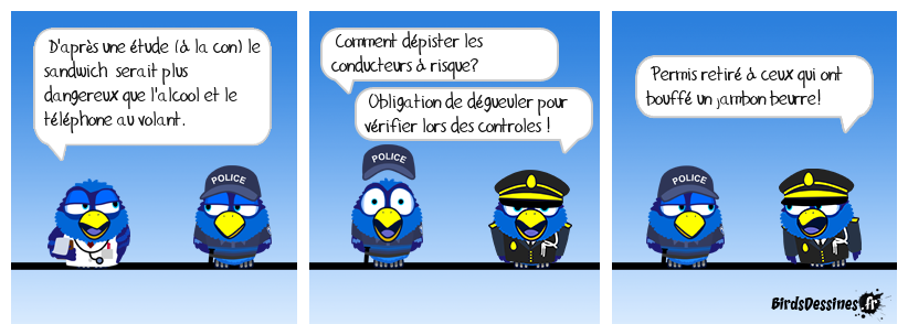 Case 1:Bird 1: D'après une étude (à la con) le sandwich serait plus dangereux que l'alcool et le téléphone au volant. | Case 2: Bird 1: Comment dépister les conducteurs à risque? Bird 2: Obligation de dégueuler pour vérifier lors des controles ! | Case 3: Bird 1: Permis retiré à ceux qui ont bouffé un jambon beurre!