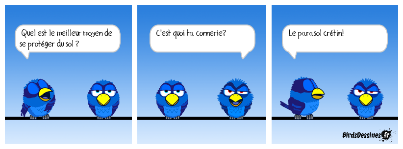 Case 1:Bird 1: Quel est le meilleur moyen de se protéger du sol ? | Case 2: Bird 1: C'est quoi ta connerie? | Case 3: Bird 1: Le parasol crétin!