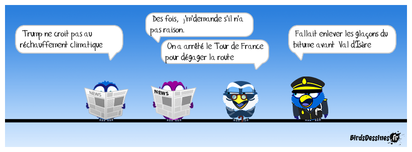 Case 1:Bird 1: Trump ne croit pas au réchauffement climatique | Case 2: Bird 1: Des fois, j'm'demande s'il n'a pas raison. Bird 2: On a arrêté le Tour de France pour dégager la route | Case 3: Bird 1: Fallait enlever les glaçons du bitume avant Val d'Isère