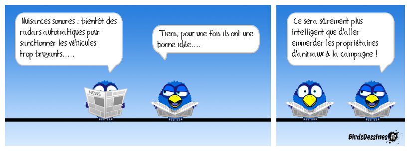 Case 1:Bird 1: Nuisances sonores : bientôt des radars automatiques pour sanctionner les véhicules trop bruyants..... | Case 2: Bird 1: Tiens, pour une fois ils ont une bonne idée.... | Case 3: Bird 1: Ce sera sûrement plus intelligent que d'aller emmerder les propriétaires d'animaux à la campagne !