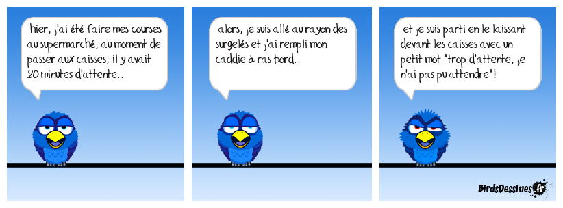 Case 1:Bird 1: hier, j'ai été faire mes courses au supermarché, au moment de passer aux caisses, il y avait 20 minutes d'attente.. | Case 2: Bird 1: alors, je suis allé au rayon des surgelés et j'ai rempli mon caddie à ras bord.. | Case 3: Bird 1: et je suis parti en le laissant devant les caisses avec un petit mot "trop d'attente, je n'ai pas pu attendre"!