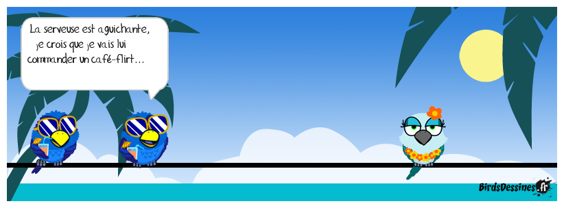 Case 1:Bird 1: La serveuse est aguichante, je crois que je vais lui commander un café-flirt... | Case 2: | Case 3: