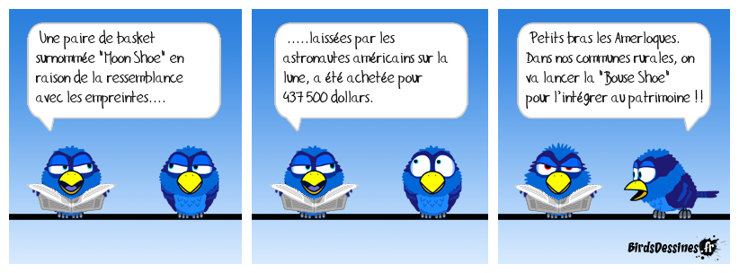 Case 1:Bird 1: Une paire de basket surnommée "Moon Shoe" en raison de la ressemblance avec les empreintes.... | Case 2: Bird 1: .....laissées par les astronautes américains sur la lune, a été achetée pour 437 500 dollars. | Case 3: Bird 1: Petits bras les Amerloques. Dans nos communes rurales, on va lancer la "Bouse Shoe" pour l’intégrer au patrimoine !!