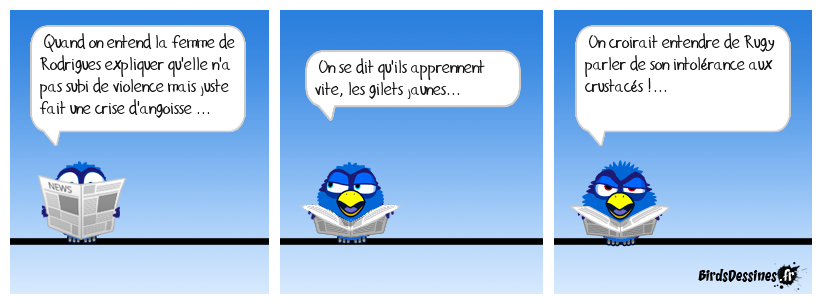 Case 1:Bird 1: Quand on entend la femme de Rodrigues expliquer qu'elle n'a pas subi de violence mais juste fait une crise d'angoisse ... | Case 2: Bird 1: On se dit qu'ils apprennent vite, les gilets jaunes... | Case 3: Bird 1: On croirait entendre de Rugy parler de son intolérance aux crustacés !...