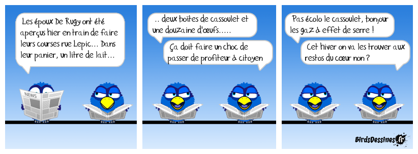 Case 1:Bird 1: Les époux De Rugy ont été aperçus hier en train de faire leurs courses rue Lepic... Dans leur panier, un litre de lait... | Case 2: Bird 1: .. deux boîtes de cassoulet et une douzaine d'œufs..... Bird 2: Ça doit faire un choc de passer de profiteur à citoyen normal ! | Case 3: Bird 1: Pas écolo le cassoulet, bonjour les gaz à effet de serre ! Bird 2: Cet hiver on va les trouver aux restos du cœur non ?