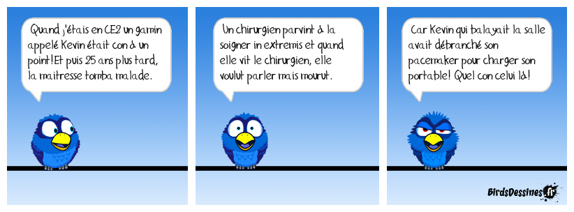 Case 1:Bird 1: Quand j'étais en CE2 un gamin appelé Kevin était con à un point!Et puis 25 ans plus tard, la maitresse tomba malade. | Case 2: Bird 1: Un chirurgien parvint à la soigner in extremis et quand elle vit le chirurgien, elle voulut parler mais mourut. | Case 3: Bird 1: Car Kevin qui balayait la salle avait débranché son pacemaker pour charger son portable! Quel con celui là!