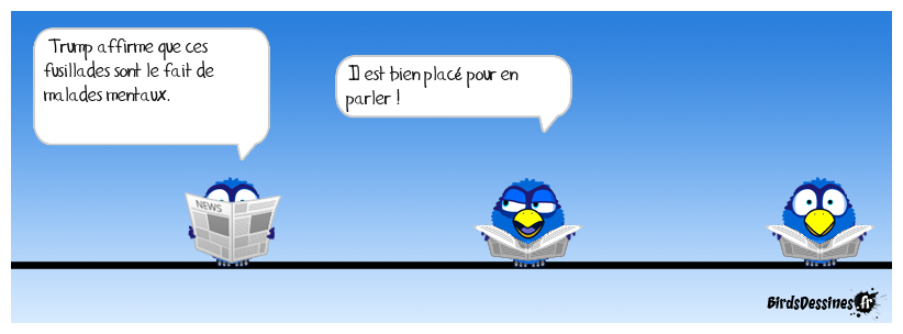 Case 1:Bird 1: Trump affirme que ces fusillades sont le fait de malades mentaux. | Case 2: Bird 1: Il est bien placé pour en parler ! | Case 3: