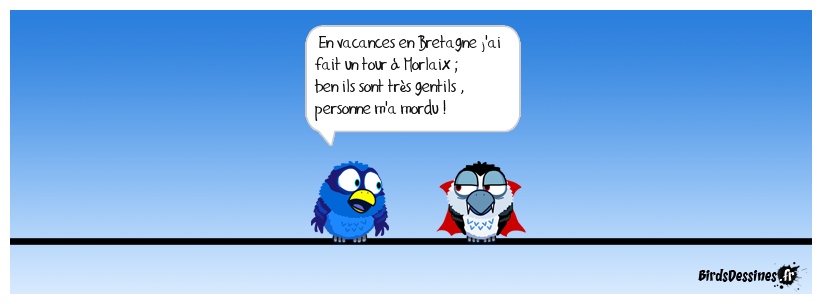 Case 1: | Case 2: Bird 1: En vacances en Bretagne j'ai fait un tour à Morlaix ; ben ils sont très gentils , personne m'a mordu ! | Case 3: