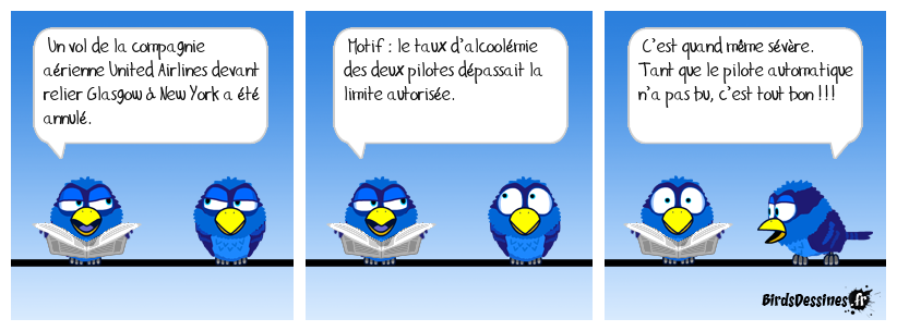 Case 1:Bird 1: Un vol de la compagnie aérienne United Airlines devant relier Glasgow à New York a été annulé. | Case 2: Bird 1: Motif : le taux d’alcoolémie des deux pilotes dépassait la limite autorisée. | Case 3: Bird 1: C’est quand même sévère. Tant que le pilote automatique n’a pas bu, c’est tout bon !!!