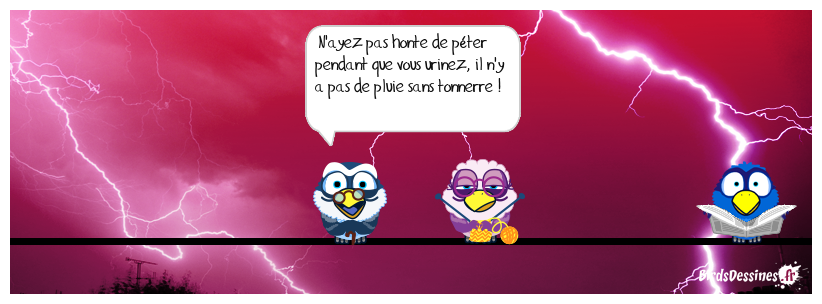 Case 1: | Case 2: Bird 1: N'ayez pas honte de péter pendant que vous urinez, il n'y a pas de pluie sans tonnerre ! | Case 3: