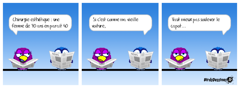 Case 1:Bird 1: Chirurgie esthétique : une femme de 70 ans en parait 40 | Case 2: Bird 1: Si c'est comme ma vieille voiture, | Case 3: Bird 1: Vaut mieux pas soulever le capot...