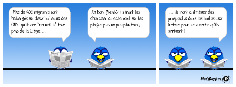 Case 1:Bird 1: Plus de 400 migrants sont hébergés sur deux bateaux des ONG, qu'ils ont "recueillis" tout près de la Libye.... | Case 2: Bird 1: Ah bon. Bientôt ils iront les chercher directement sur les plages puis un peu plus tard.... | Case 3: Bird 1: ... ils iront distribuer des prospectus dans les boîtes aux lettres pour les avertir qu'ils arrivent !