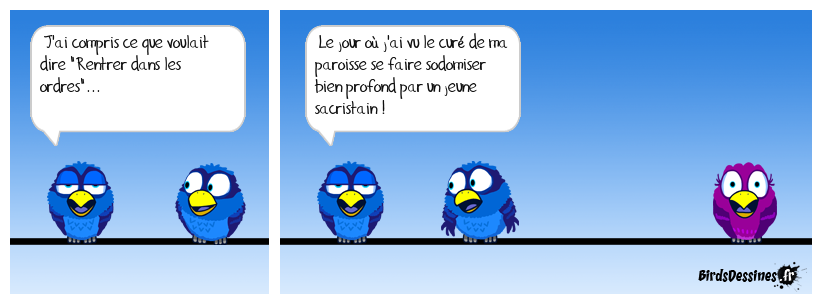 Case 1:Bird 1: J'ai compris ce que voulait dire "Rentrer dans les ordres"... | Case 2: Bird 1: Le jour où j'ai vu le curé de ma paroisse se faire sodomiser bien profond par un jeune sacristain ! | Case 3: